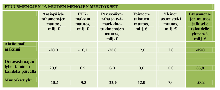 Mikäli kukaan työtön ei onnistu välttämään rangaistusta (eli työryhmän uuskielellä kukaan ei aktivoidu), alenevat julkiset menot arvion mukaan 53 miljoonaa. Käytännössä raportti suoraan myöntää, että ”aktiivimalli” on työttömyysturvan leikkaus. Hallitus laskee sen varaan, etteivät kaikki työttömät kuitenkaan löydä töitä. Kuinkapa voisivatkaan? Lisäksi raportti myös suoraan arvioi, että työttömyysturvan leikkaaminen johtaa toimeentulotukimenojen kasvuun.