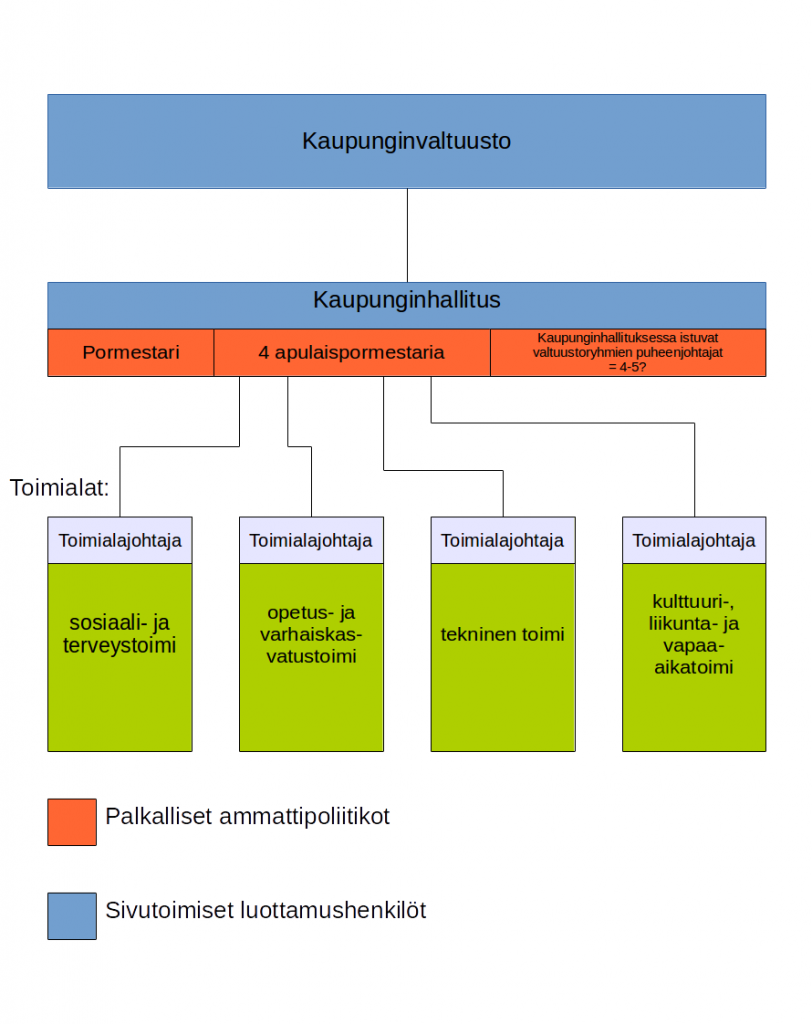 Johtamisjärjestelmän keskeinen julkilausuttu tarkoitus on siirtää valtaa virkamiehiltä poliitikoille. Kuitenkin järjestelmän uudistukseen sisältyy myös ajatus neljän toimialajohtajan valitsemisesta. Nämä virkamiesjohtajat toimisivat aiemmin mainittujen neljän superlautakunnan esittelijöinä. Ainakin minun on hankala perustella itselleni, miten virkamiesvallan keskittäminen neljälle johtavalle virkamiehelle auttaa vallan siirtämisessä virkamiehiltä poliitikoille. Mieleen tulevat nykyiset virkatoimiset apulaiskaupunginjohtajat.