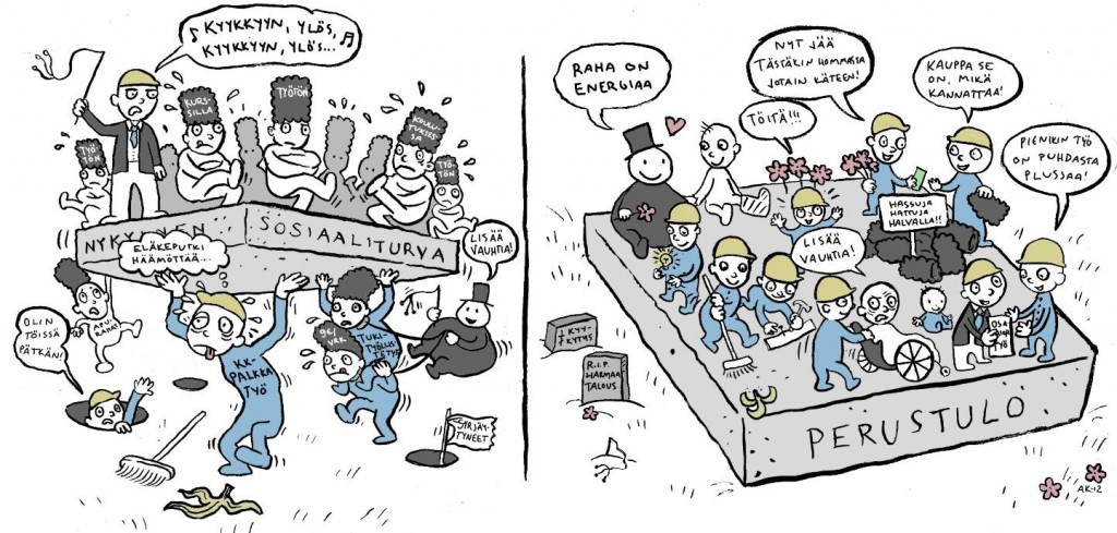 Miksi Lasse Männistö, kovan linjan kokoomuslainen, kannattaa perustuloa? Tuskin ainakaan siksi, että haluaisi taata työntekijöille mahdollisimman hyvät neuvotteluasemat suhteessa työnantajiin. Eiköhän Männistö kaipaa perustulolta sitä, mikä on monesti aiemminkin ääneen lausuttu: työntekijän olisi perustulon turvin helpompi ottaa vastaan satunnaista ja pienipalkkaistakin työtä, koska "pienikin työ on puhdasta plussaa" (kuten hiekkalaatikkokuvassa yksi hahmoista asian tiivistikin).